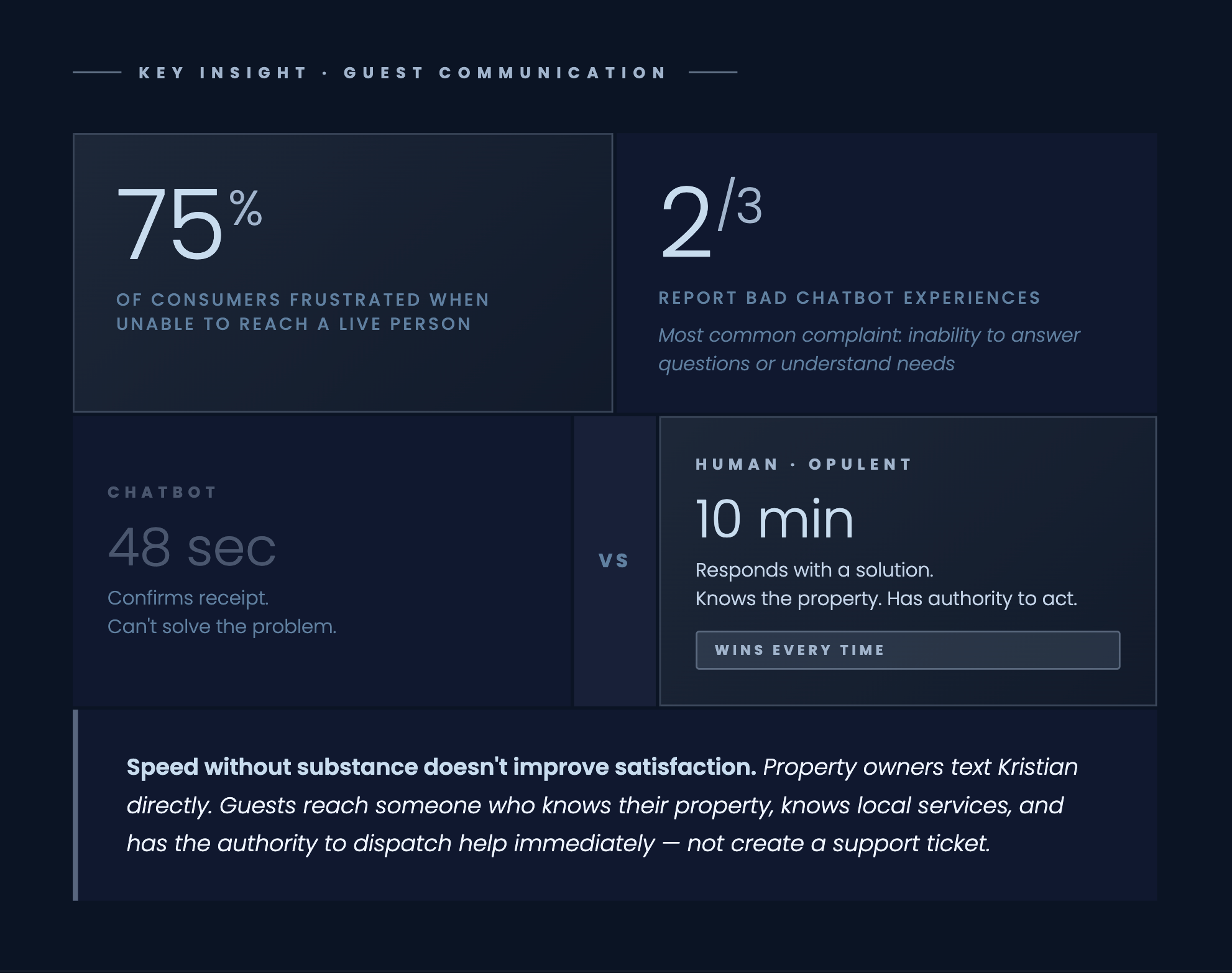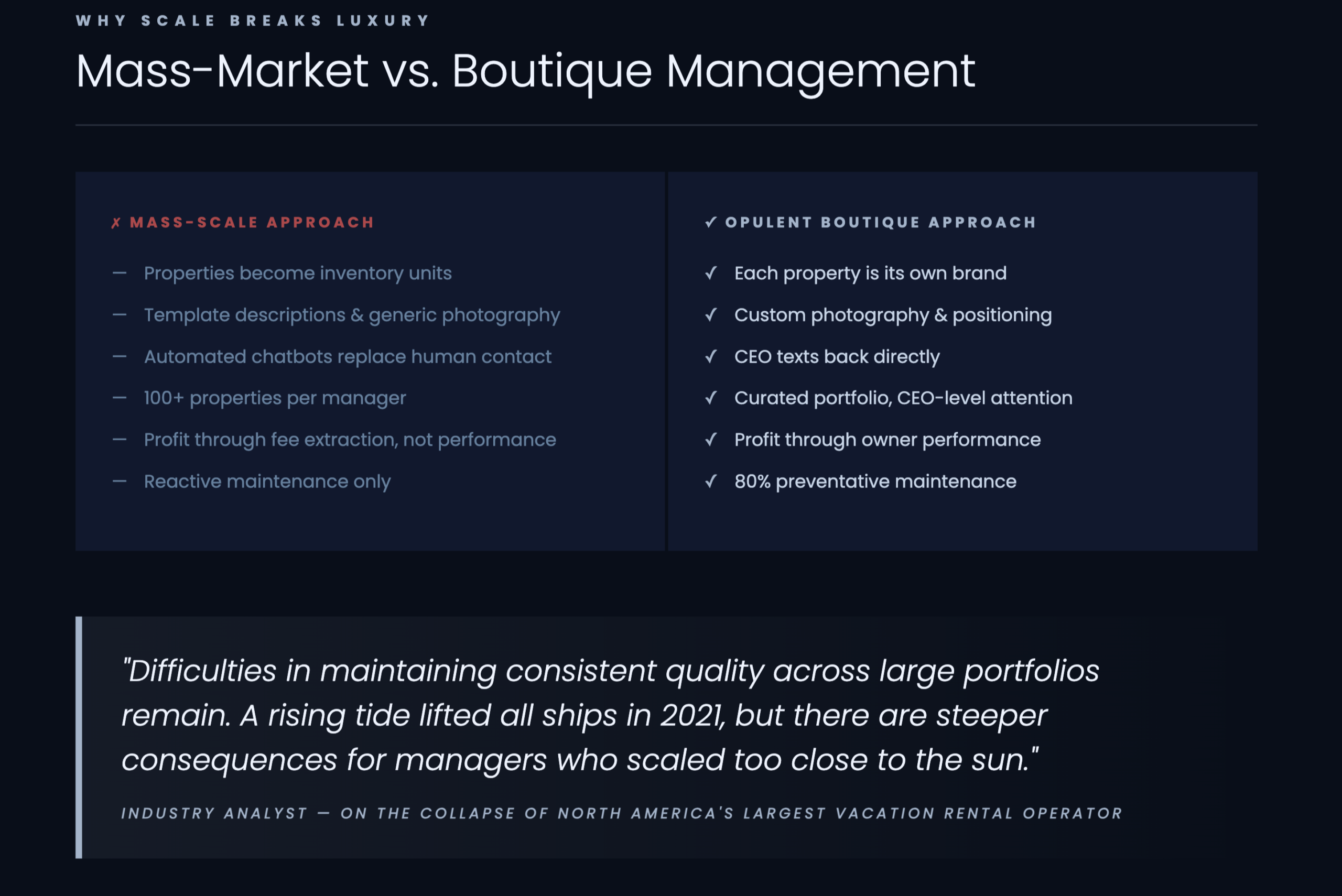 The alternative: Boutique luxury management through curated portfolios, property-level branding, human accountability, preventative asset care, and revenue growth through performance rather than fee extraction.