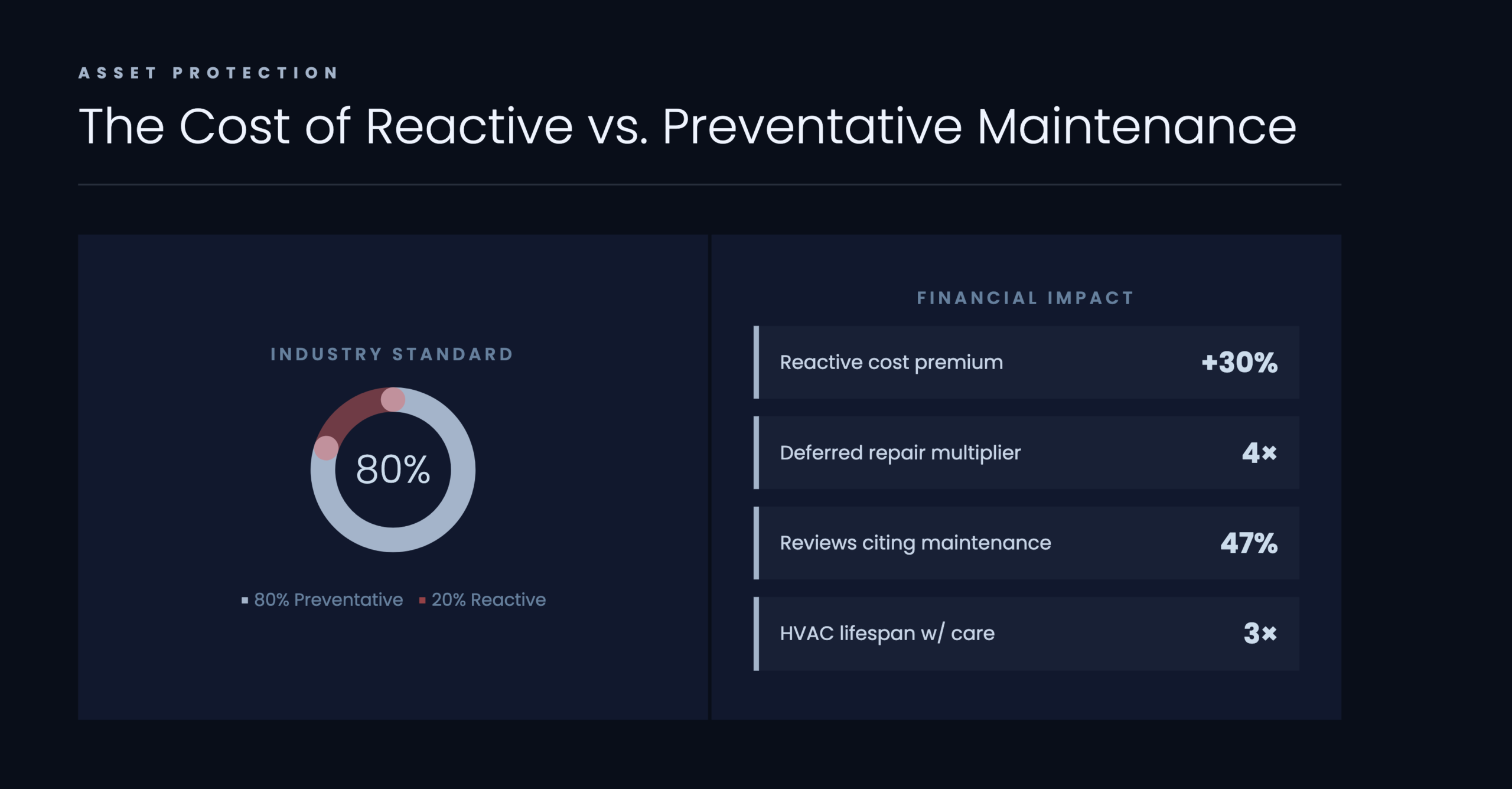 Industry benchmark: 80% preventative, 20% reactive maintenance. The financial logic: