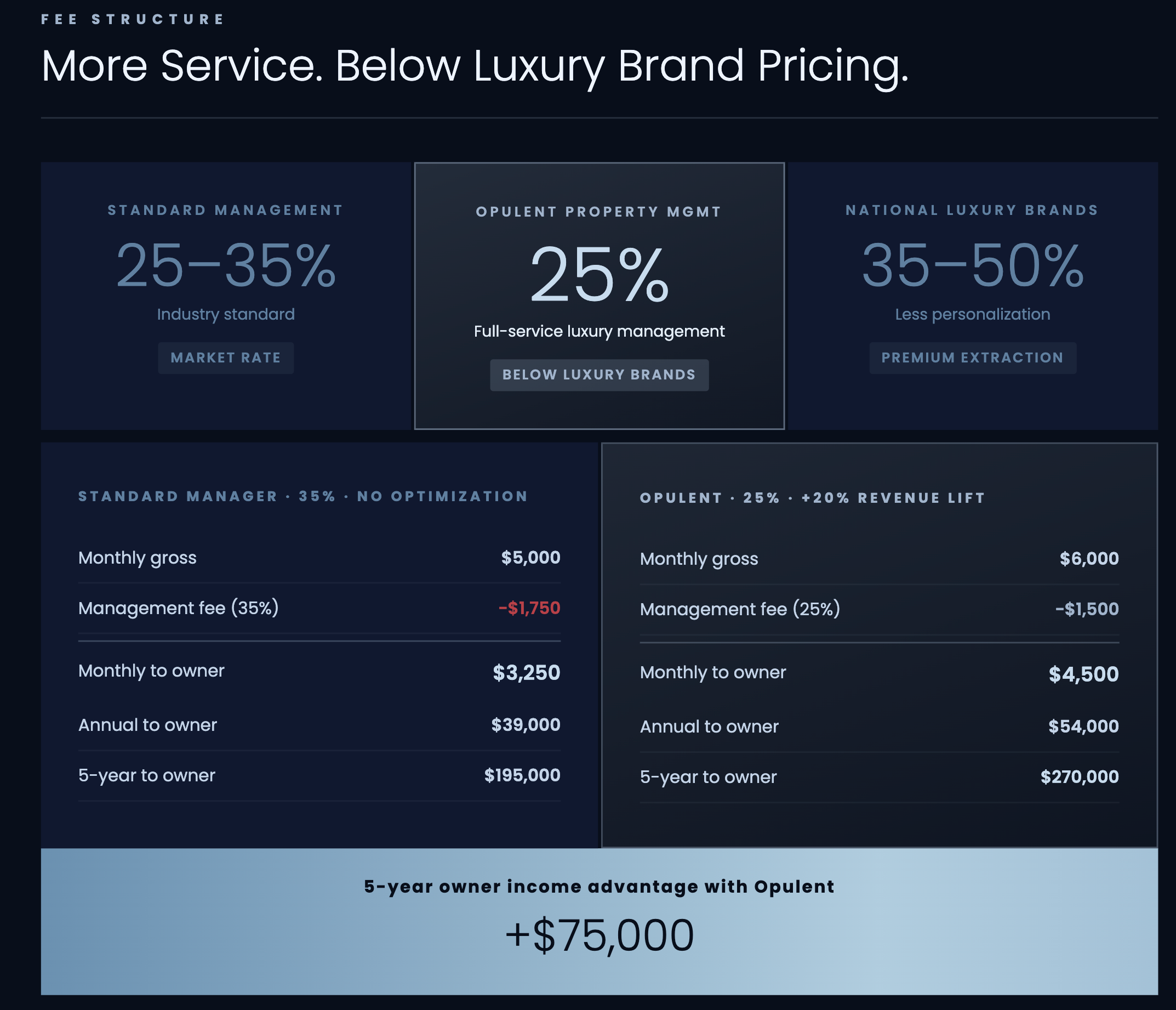 At 25%, Opulent sits at the entry point of standard management—while delivering service that exceeds what national luxury brands charge 35–50% to provide. The fee is not a luxury premium. It reflects what full-service, hands-on management of premium properties—and the owners and guests they attract—actually requires.