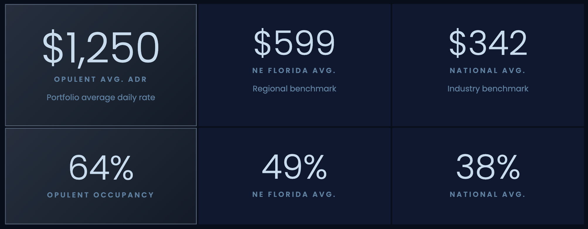 Opulent Property Management is a boutique luxury vacation rental company serving Northeast Florida’s First Coast — Ponte Vedra Beach, Jacksonville Beach, and St. Augustine. Unlike volume-focused operators, Opulent manages a curated portfolio of $1M+ properties with CEO-level attention, property-specific branding, and a hands-on concierge approach for both owners and guests. The result: a portfolio average of $1,250 ADR and 64% occupancy — more than double the national benchmark — at a 25% management fee that sits below what national luxury brands charge for less.